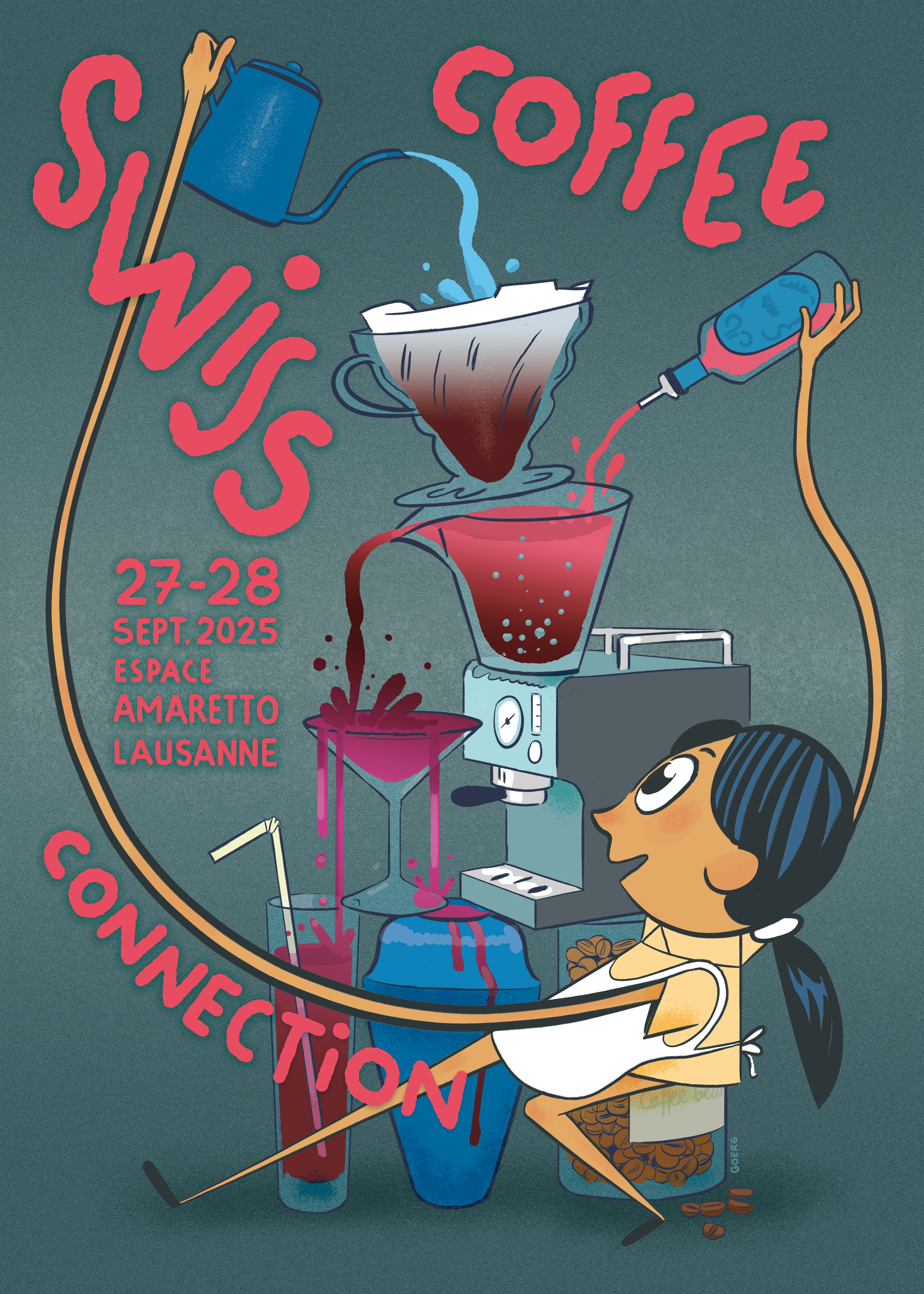 Cette année encore j’ai eu le plaisir de faire l’affiche du Swiss coffee Connection 2025. Je n’ai pas pu m’y rendre mais j’aurais bien voulu. Il y avait même des verres à dégustation avec mon écriture dessus.