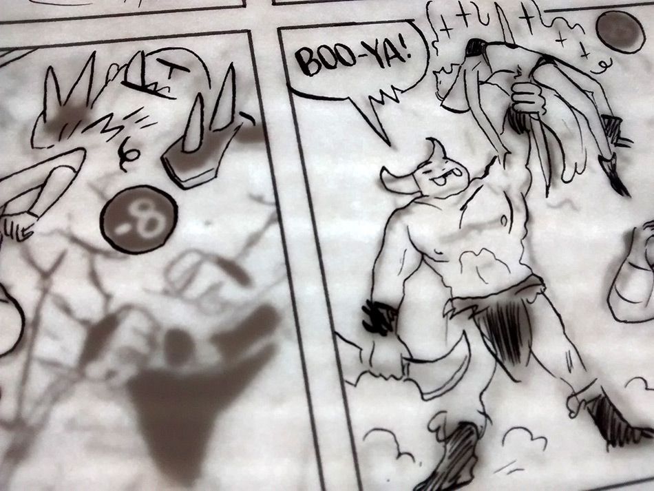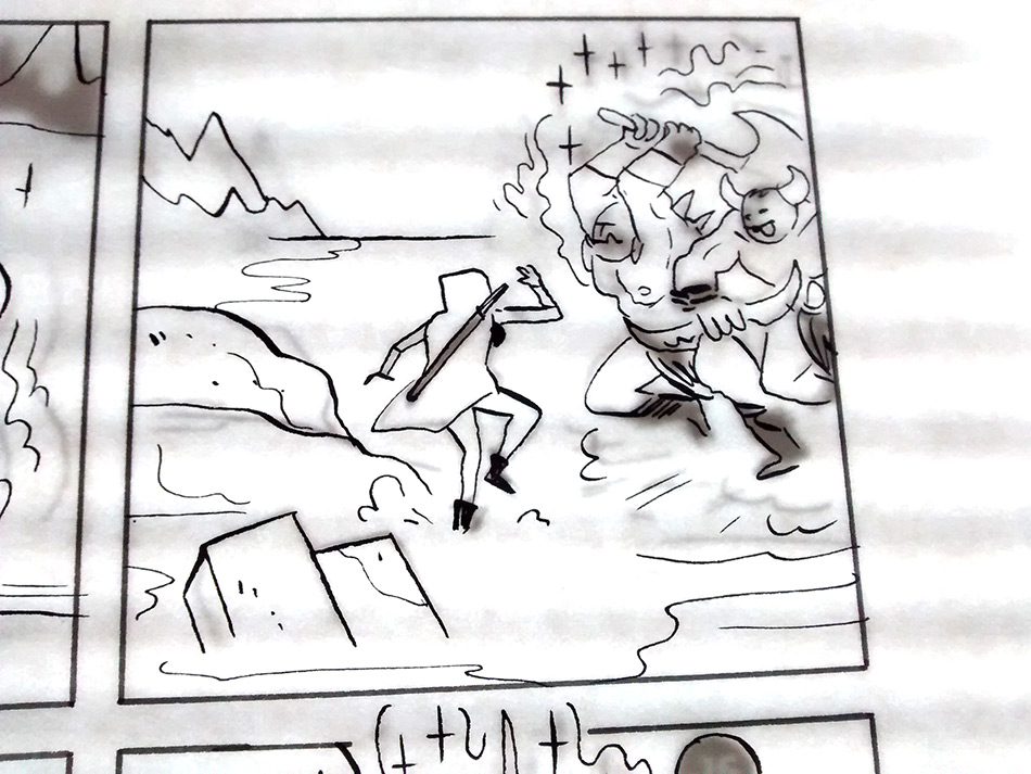 Pour le process on a gardé la même formule : il a défini les récits d’origine. On a corrigé le découpage ensemble, puis il crayonne, je re-corrige éventuellement et j’encre.