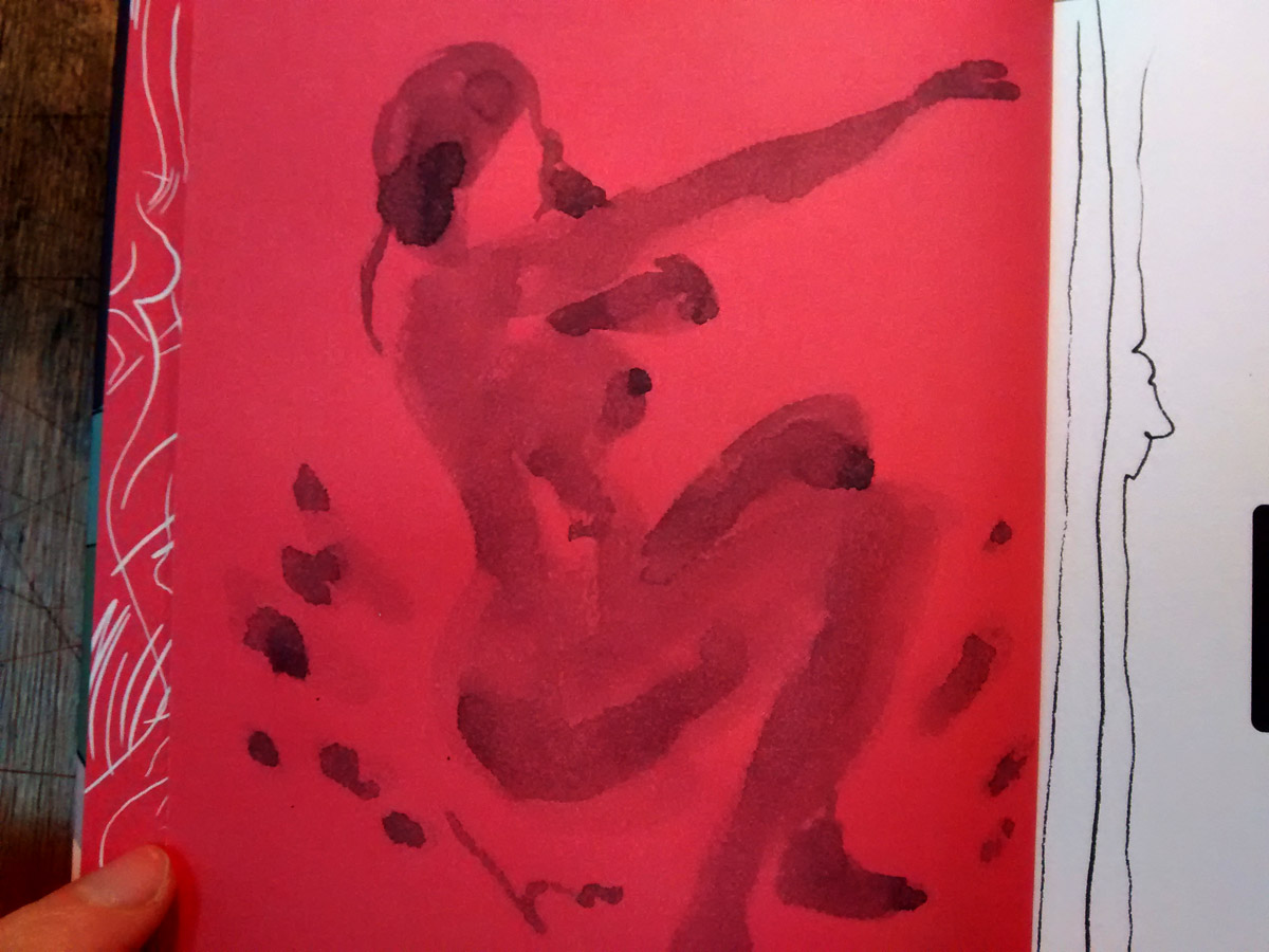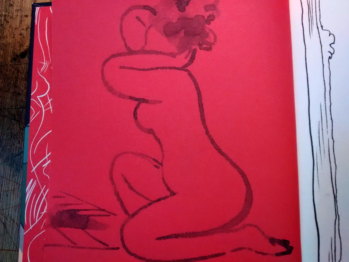 Cette fois-ci (chaque livre reçoit son mode de dédicace), sans originalité aucune je duplique le même dessin en de multiples variantes. C’est une exercice assez étonnant et plutôt agréable, on se met à maîtriser de plus en plus les mêmes courbes du trait. Dans les derniers dessins je reprends un gros pinceau et un peu d’aquarelle (histoire de varier un peu quand même). J’imagine une femme nue qui serait peinte sur une toile et que le héros du récit (Jean-Michel) dessine lors de son passage au musée.