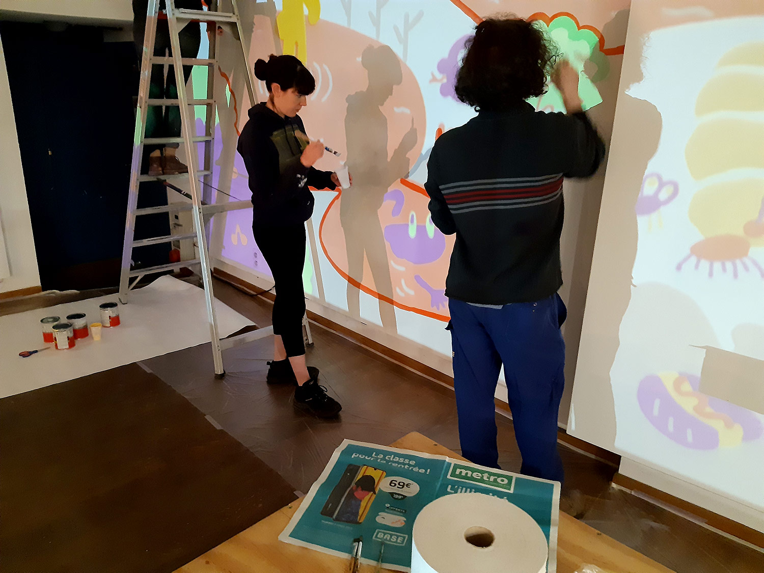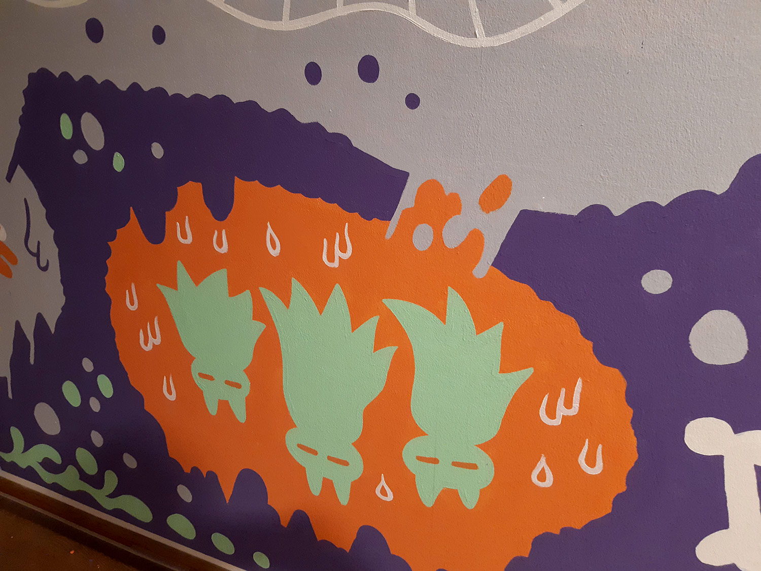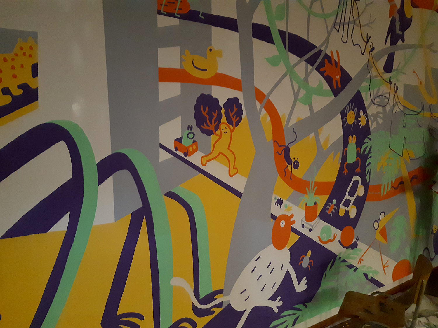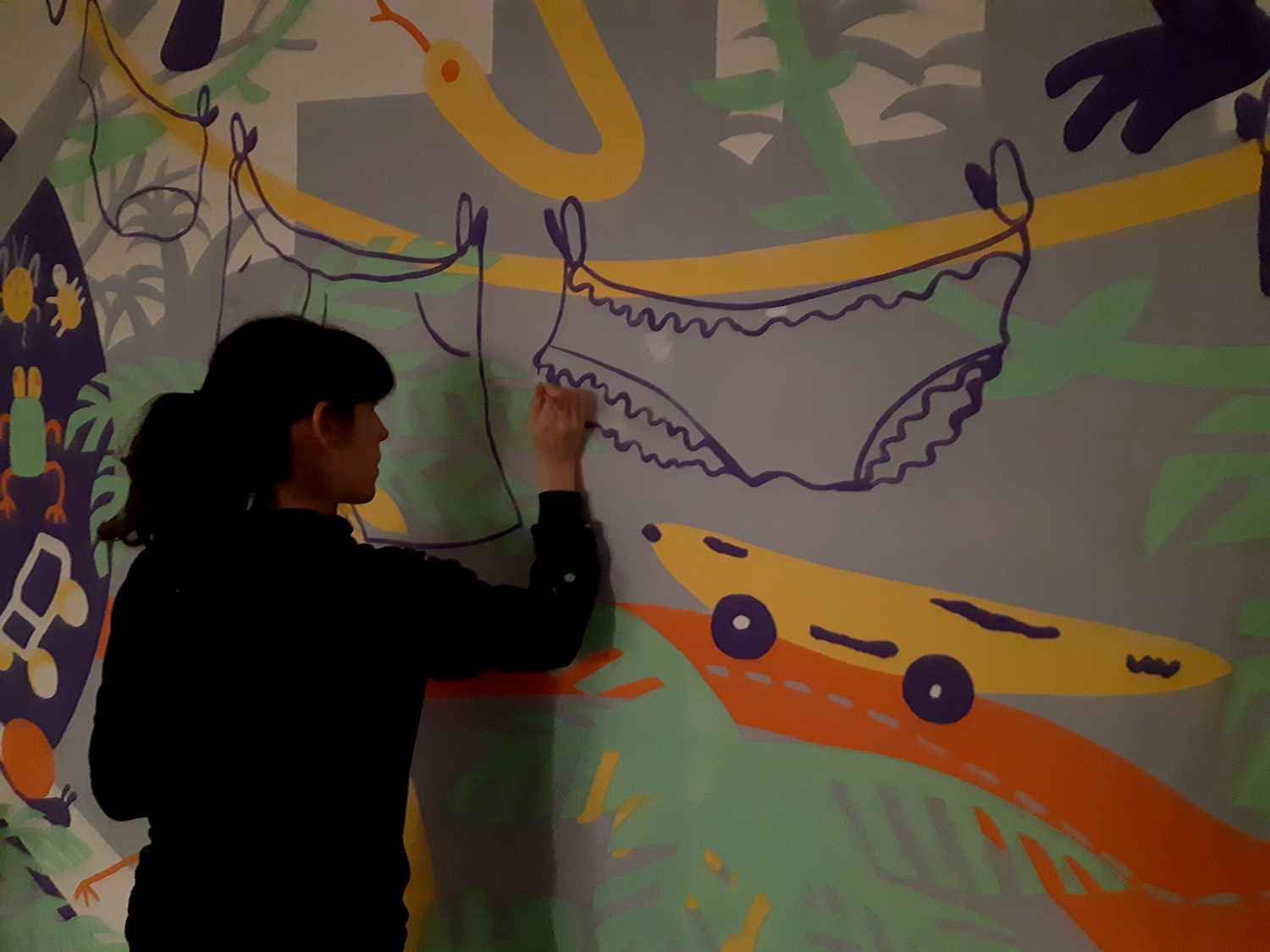 À l’occasion de l’ouverture de la saison culturelle du centre culturel Jacques Franck à Saint-Gille, nous avons peint avec Noémie Marsily, Rebecca Rosen et Mortis Ghost, une fresque de plusieurs mètres sur le thème urban jungle. Cette peinture murale divisée sur 3 murs sera visible pendant un an avant de passer la main à un autre collectif d’artistes.