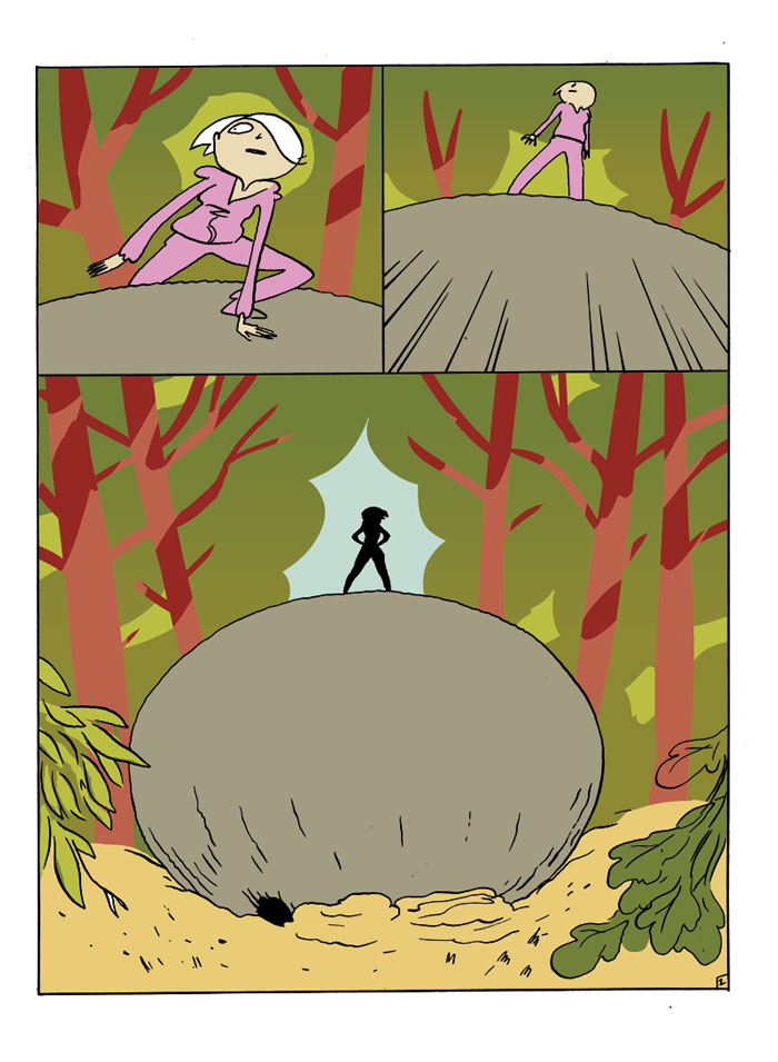 Et en même temps je suis sûrement encore loin du résultat final. Changement de ton si j’ose dire, j’ai envie d’autre chose : mise en couleur à l’ordi et retour aux cases, ça faisait longtemps. J’ai envie de dégradés et de couleurs franches. Là le vert est trop vert, c’est encore trop gentil à mon goût. J’ai même fait des speed-lines, vous avez vu ? Et ça n’est qu’un début !! Tout ça c’est pour un projet dont je reparlerai très bientôt.