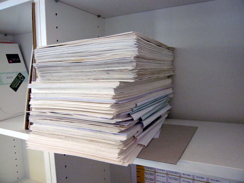 Pour une fois que je range mon atelier, ça mérite une petite photo, histoire de se rappeler que c’est possible. A force de rassembler les pages étalées à gauche à droite je me suis constitué une belle pile de planches, grosso modo deux ans de travail. J’utilise du papier épais mais quand même, ça fait son petit effet, un soupir de contentement et ça repart.