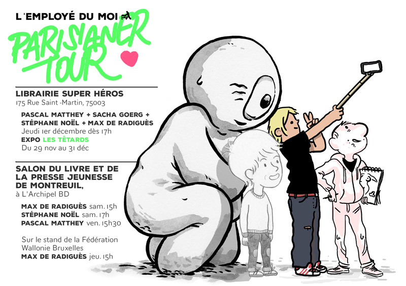 Ce jeudi soir je serai à Paris avec mes copains de l’employé du Moi pour dédicacer chez super héros pour dédicacer nu. Venez nous voir !